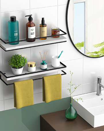 - VERSATILE WALL SHELF: In the bathroom. the storage shelf can hold skincare items such as shampoo. conditioner. shower gel. lotions. and perfumes. In the kitchen. the shelf can be used to put spice and seasoning bottles. It also can be used in the dining room. bedroom. living room. and office.